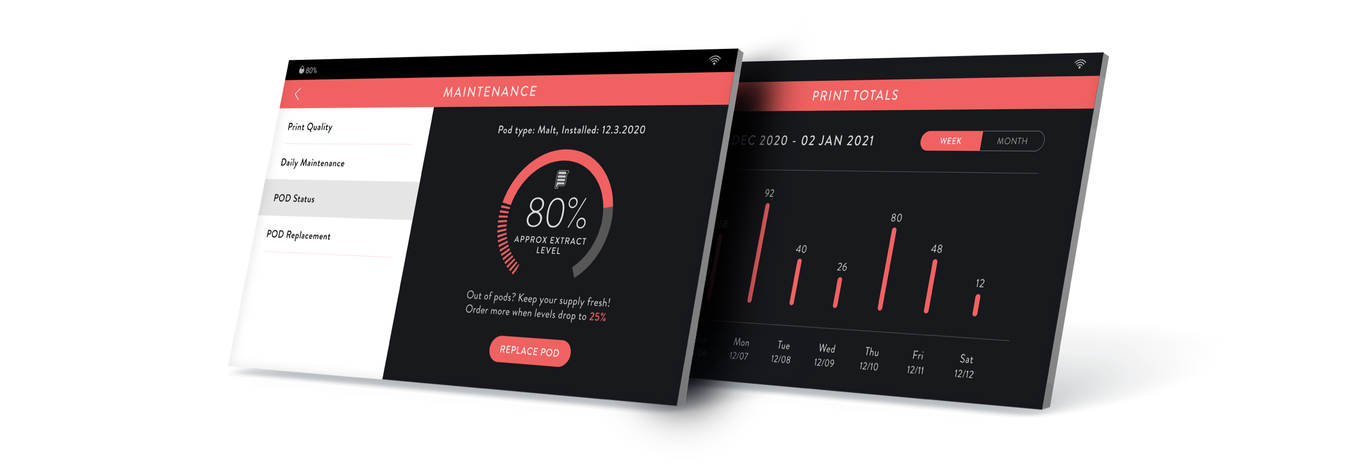 Ingenious-designed printing machine with quality touch screen that makes it easy to create personalized designs on coffee, beer or cocktails.