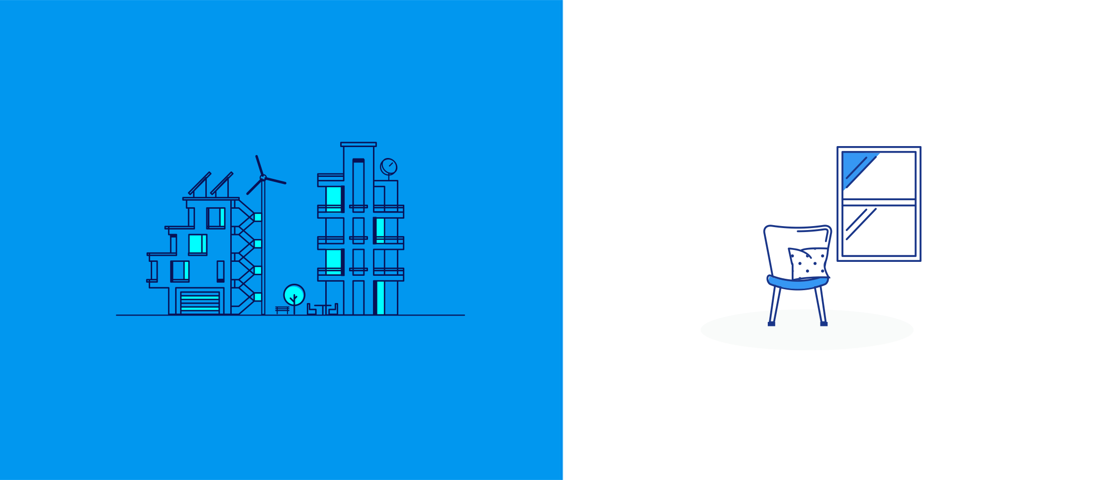The Illustrations change as you get closer to home, from the city skyline – to the neighborhood – to your living room.